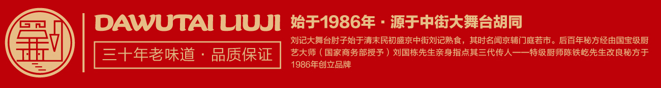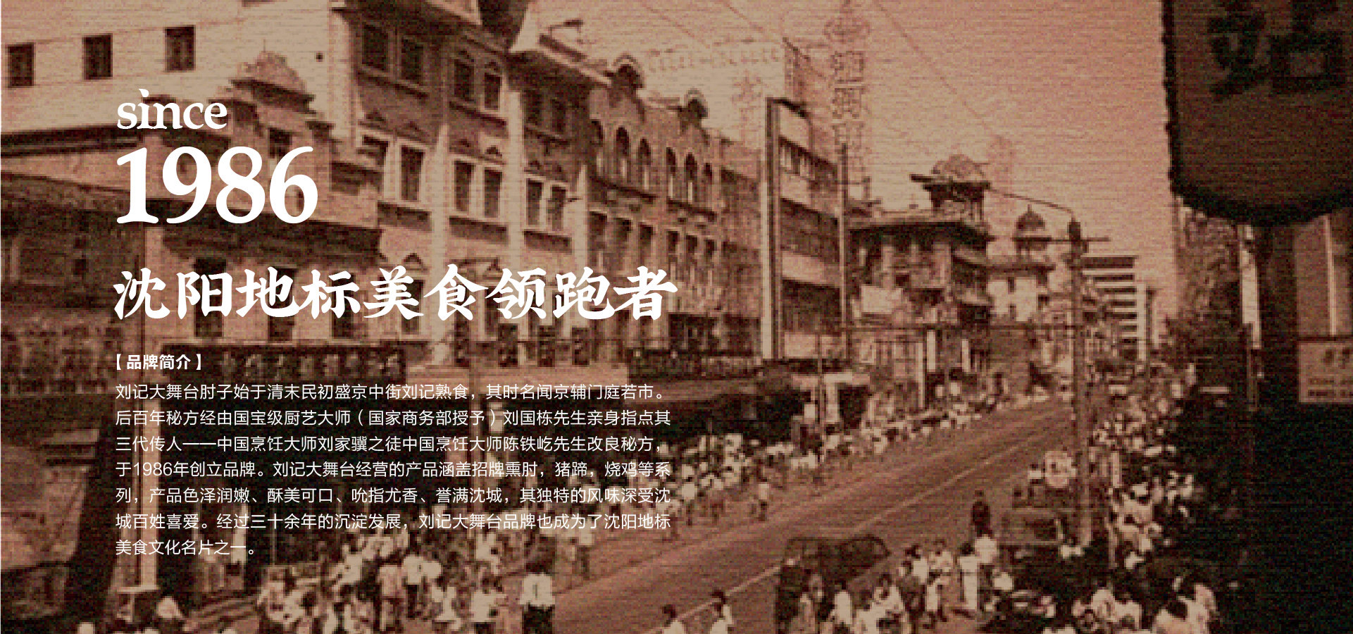 盛京,昔乃大清王朝發(fā)祥之地。劉記大舞臺肘子始于清末民初盛京中街劉記熟食,其時名聞京輔門庭若市。后百年秘方經(jīng)由國寶級廚藝大師(國家商務(wù)部授予)劉國棟先生親身指點其三代傳人——中國烹飪大師劉家驥之徒中國烹飪大師陳鐵屹先生改良秘方,于1986年創(chuàng)立品牌。劉記大舞臺經(jīng)營的產(chǎn)品涵蓋招牌熏肘,豬蹄,燒雞等系列,產(chǎn)品色澤潤嫩、酥美可口、吮指尤香、譽滿沈城,遂成古今絕味,其獨特的風(fēng)味深受沈城百姓喜愛。經(jīng)過三十余年的沉淀發(fā)展,劉記大舞臺品牌也成為了沈陽地標美食文化名片之一。
